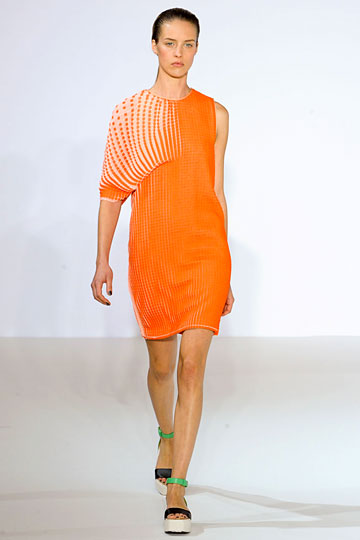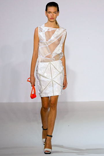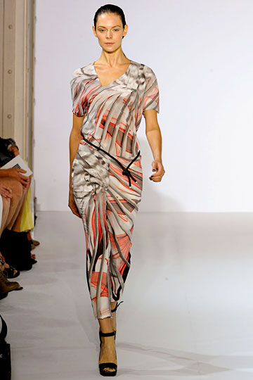 The nude and tangerine colours, as well as the chic black pieces were all minimal with the maximum amount of gloss that lit up the runway every time one of the models hit the simple backed runway. The thin belting, the ruched pant suits all unexpected. The V-neck was a very apparent piece of the collection. Although subtle it was very modern and forward though out each variation. Also new to the design foray was the graphic print blocking. Shown on long gowns and short dresses but nothing like you’ve seen before in either silhouette.